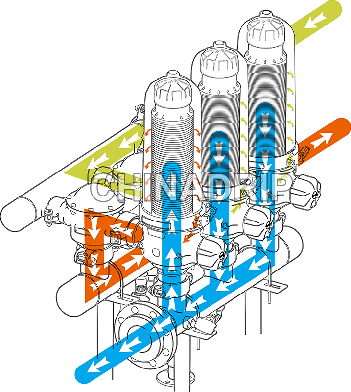 กระบวนการกรอง: ตัวควบคุมจะควบคุมทิศทางของวาล์วย้อนเพื่อให้ตัวกรองเข้าสู่ขั้นตอนการกรอง: น้ำจากแหล่งจะเข้าสู่ตัวกรองผ่านท่อทางเข้าของระบบ วาล์วล้างย้อน และทางเข้าตัวกรองทีละอัน จากนั้นสิ่งสกปรกที่เกาะอยู่ด้วยแผ่นดิสก์และน้ำสะอาดจะไหลผ่านช่องกรองไปยังท่อทางออกของระบบ